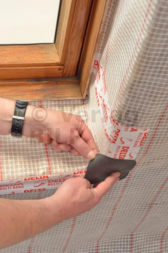 2. DELTA®-FLEXX BAND erfordert bei der Verwendung von DELTA®-FLEXX BAND als Putzuntergrund die Verwendung von DELTA®-PREN Primer, der das Geotextil anfeuchtet. Alle 10 cm versetzt mechanisch befestigen.