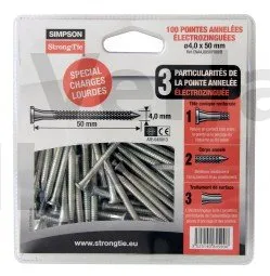 CNA galvanisch verzinkte Kammnägeln werden für strukturelle Montagen von Simpson Strong-Tie Verbindern empfohlen. Alle unsere Tests wurden mit dieser Art von Nägeln durchgeführt. Für mehr Rückverfolgbarkeit auf den Baustellen sind sie mit einem ≠-Stempel versehen, eine Qualitätsgarantie ohnegleichen.