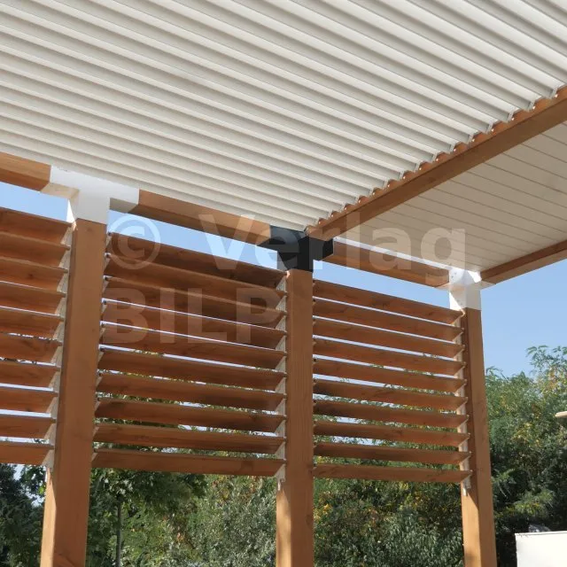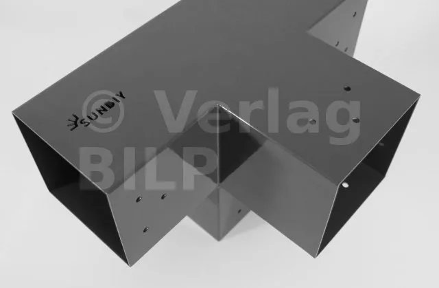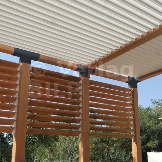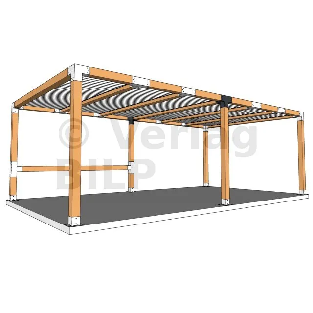 Damit kann eine 120x120mm-Stütze senkrecht zu einem 120x120mm-Chevron angebracht werden, die insgesamt von einem 120x120mm-Vertikaltopf unterstützt wird.