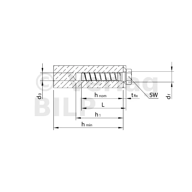 - Schraube zum Einsetzen ohne Dübel in ein vorgebohrtes Loch. Der Durchmesser der Bohrkrone zum Vorbohren wird im Merkmal "Nenndurchmesser der Bohrkrone, d0" angegeben.