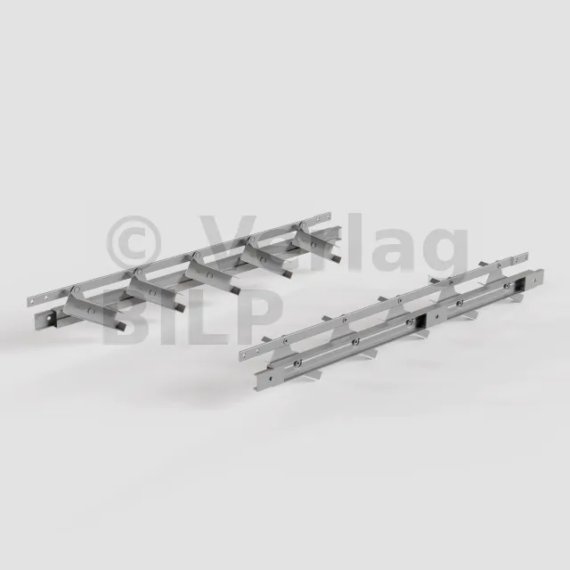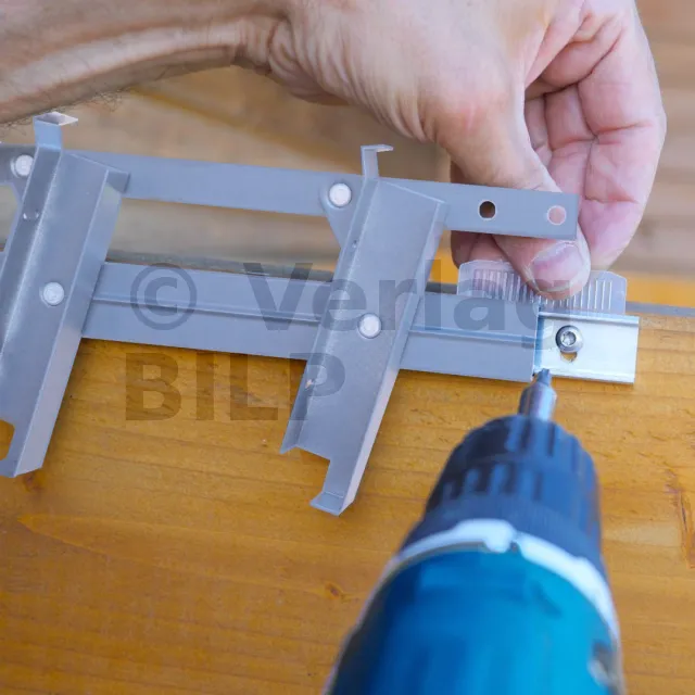 Abstand zwischen den Stützen: Unter der Annahme, dass der Mechanismus zwischen zwei Balken befestigt ist, muss der Abstand zwischen diesen beiden Balken gleich der Länge der Lamellen + 35 mm sein: 2 x 15 mm (Breite des Mechanismuskörpers) + 5 mm Spiel.