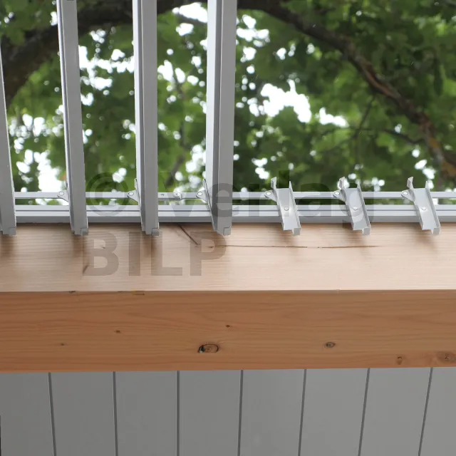 Unsichtbare Befestigung: Die Mechanismen werden durch ein spezielles Endstück zusammengefügt, das selbst am Träger (z. B. Pergolabalken) befestigt ist. Die Befestigung muss einen Durchmesser von 5 mm haben und aus Edelstahl bestehen. Seine Länge und Art hängen vom Träger ab: