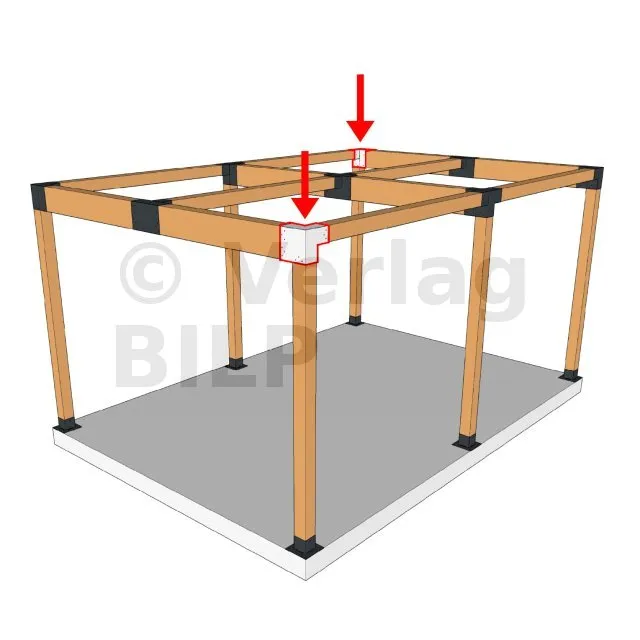 Es wird in einer Außenecke verwendet. Mit diesem Verbinder können Sie einen großen Balken von 240 x 120 mm senkrecht mit einem Balken von 120 x 120 mm verbinden, wobei das Ganze von einem vertikalen Pfosten von 120 x 120 mm getragen wird.