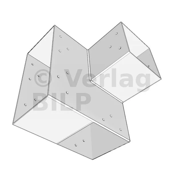 Es wird in einer Außenecke verwendet. Mit diesem Verbinder können Sie einen großen Balken von 240 x 120 mm senkrecht mit einem Balken von 120 x 120 mm verbinden, wobei das Ganze von einem vertikalen Pfosten von 120 x 120 mm getragen wird.