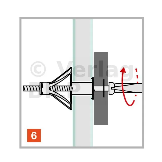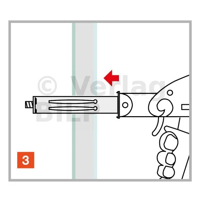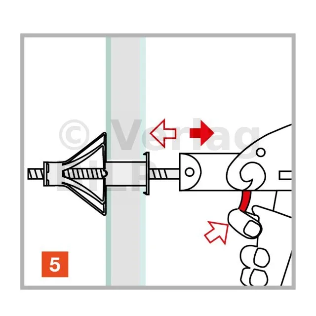 Der Dübel wird mit einer speziellen Klemme in das Loch am Träger eingesetzt. Durch die Wirkung der Zange kann der Dübel aufgespreizt und am Träger fixiert werden.