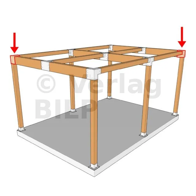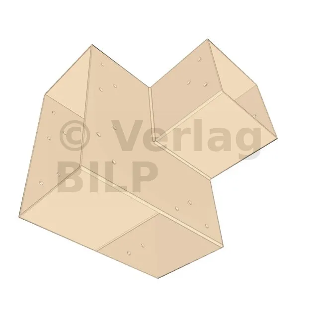 Es wird in einer Außenecke verwendet. Mit diesem Verbinder können Sie einen großen Balken von 240 x 120 mm senkrecht mit einem Balken von 120 x 120 mm verbinden, wobei das Ganze von einem vertikalen Pfosten von 120 x 120 mm getragen wird.