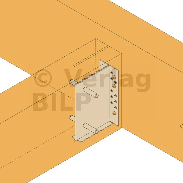 Der verdeckte T-Balkenträger ermöglicht eine unauffällige Montage. Der untere Absatz positioniert den Balkenträger in Bezug auf das Holz und erleichtert so die Montage der Stifte.