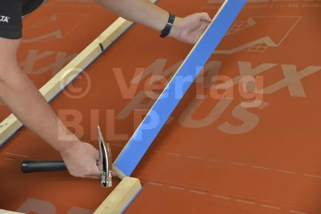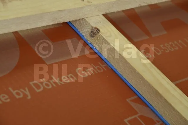 Aufnagelbares Dichtband mit einer selbstklebenden, geschlossenzelligen Polyethylenschaum-Oberfläche in Kombination mit einer integrierten Silikonfolie. Verbessert die Abdichtung zwischen DELTA® -Bahnen an den Perforationen, die durch die Befestigung der Konterlatten und Latten entstehen (kein Sickerphänomen).