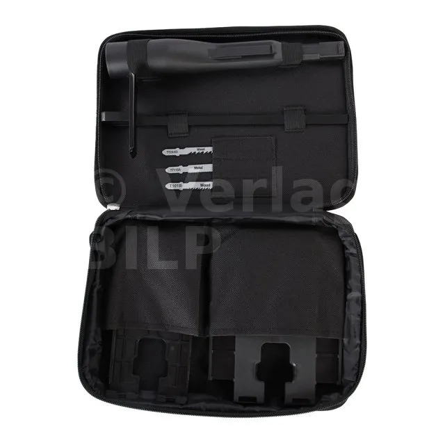 - Mit drei Hochleistungsstichsägeblättern für Kurvenschnitte in Holz, Schnitte mit hoher Geschwindigkeit in Holz und Kunststoff sowie Geradschnitte in Eisen- und Nichteisenmetallen
