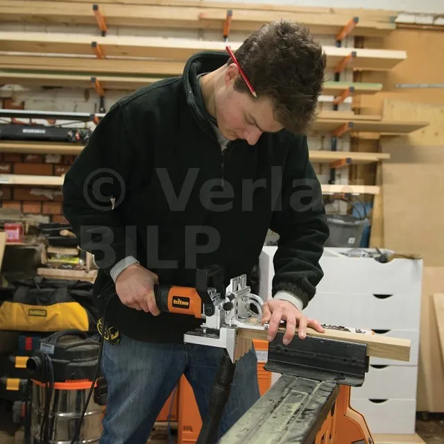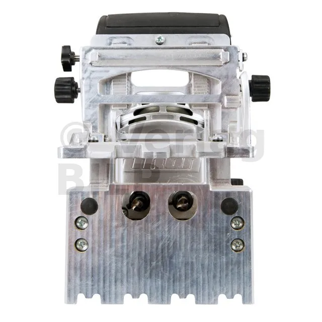 Dübelmaschine mit 710-W-Motor zum Anfertigen von zwei Dübelbohrungen im Abstand von 32 mm (Lochmitte zu Lochmitte) zugleich. Vereinfacht das Aufbauen von Möbeln und Regalen. Ganzmetallmechanismus und -getriebe gewährleisten eine lange Lebensdauer. Von 0°- bis 90°-Winkel einstellbarer Anschlag. Schnelle Bohrtiefeneinstellung von 0 bis 38 mm. Präziser Zahnstangenmechanismus erlaubt eine genaue Höheneinstellung. Transparentes Sichtfenster mit drei Linien ermöglicht exaktes Ausrichten und schnelle Wiederholungen des Bohrvorgangs. Isolierter Handgriff mit Aufbewahrungsmöglichkeit für Sechskantschlüssel. Zwei Bohrer mit je Ø 8 mm und eine strapazierfähige Gerätetasche im Lieferumfang enthalten.