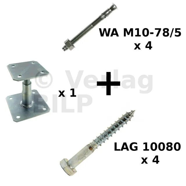 - Inhalt1 x Pfostenträger APB100/150 aus elektrolytisch verzinktem Stahl; 4 x WA-Dübel M10-78/5 aus elektrolytisch verzinktem Stahl; 4 x Zugbolzen LAG 10-80 aus weiß verzinktem Stahl.