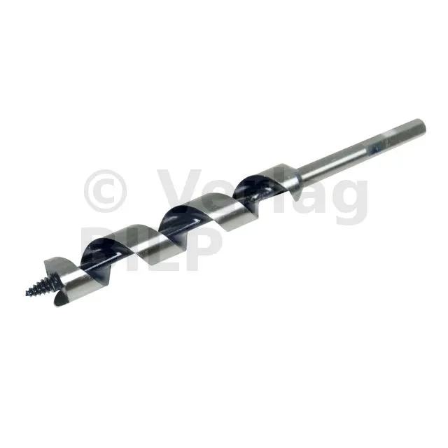 Gehärteter und präzisionsgeschliffener Schneckenbohrer aus Kohlenstoffstahl mit Sechskantschaft. Die Zentrierspitze mit Gewinde zieht sich in das Holz hinein, und ein einzigartiger Fräser leitet das Eindringen der Schneide in das Holz ein, was ein genaueres Bohren ermöglicht.