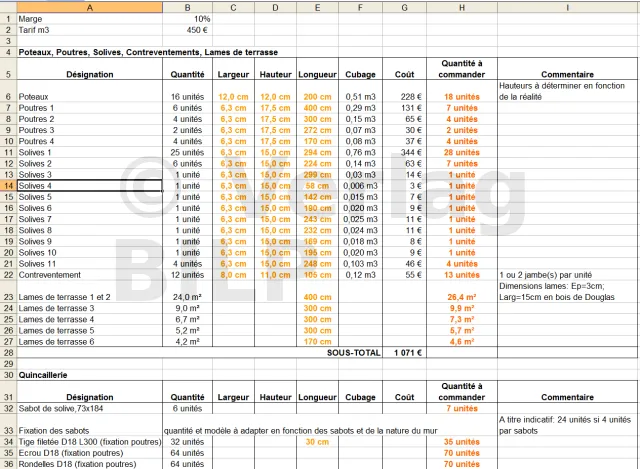 Diese Liste kann für einen Kostenvoranschlag direkt an Ihren Materialhändler geschickt werden. Die Liste liegt im EXCEL-Format vor. Sie können sie also bearbeiten, modifizieren, Ihre Informationen hinzufügen usw.