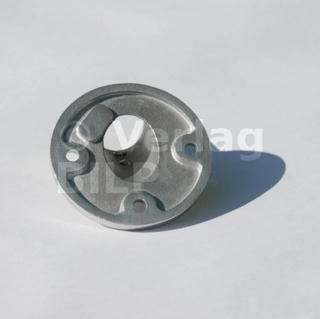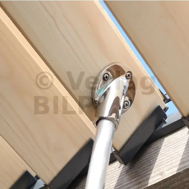 Edehlstahl-Buchstenplatte für die Betätigung der in höhenverstellbaren Lamellen. Die Buchsenplatte ist auf einer Lamelle befestigt und ermöglicht die Aufnahme der abnehmbaren Betätigungsstange. (Die Stange ist in BAUSATZ) geliefert.