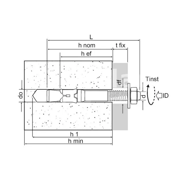 | Referenzen | Produktreferenz | Abmessungen [ØxL] [mm] | Bohr-Ø [d0] [mm] | Prof. min. Bohrtiefe [h1] [mm] | Ø Bohrung im zu befestigenden Teil (durchgehend) [df] [mm] | Schlüsselweite an der Fläche [SW] [mm] | Anziehen Drehmoment [Tinst] [Nm] | Prof. Verankerung [hef] [mm | Ep. Mindestauflage [hmin] [mm] |