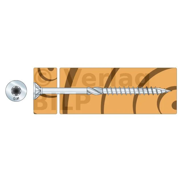 - Eine Schraube, deren Achse bei ESCR(XXX) 45 bis 90° von der Holzmaserung und bei den anderen Schrauben 90° von der Holzmaserung entfernt ist.