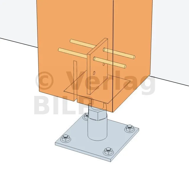 Die Verbindung zwischen Pfostenfuß und Holzpfosten erfolgt über die beiden oberen Stifte.