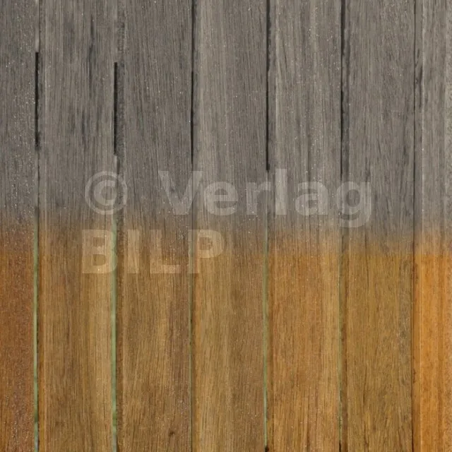- Rohes Holz (nie geschützt, von der Veredelung ausgenommen), vergraut, schmutzig, fleckig (Tannin...): Lärche, Douglasie, Autoklaven, rote Zeder, hitzeerhitzt, Teak, Ipe...