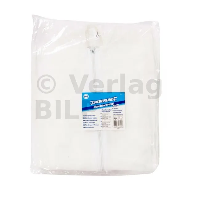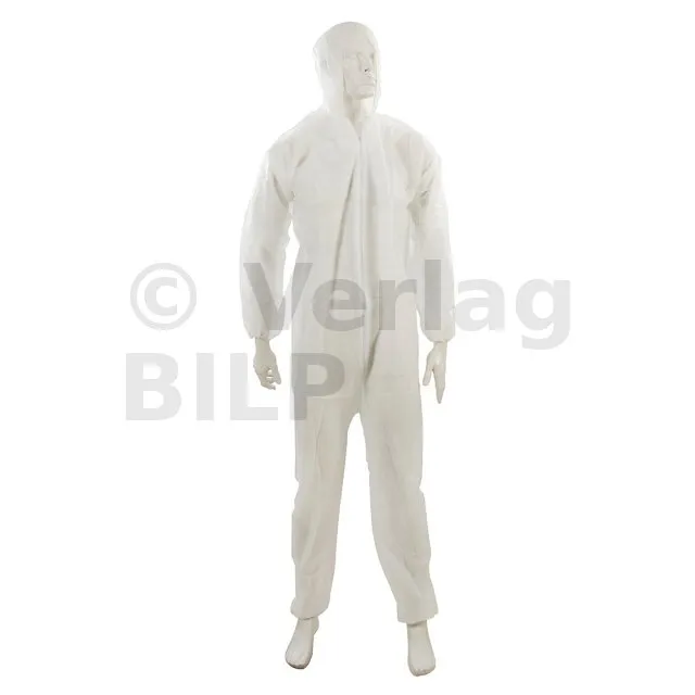 Weißer Einweg-Overall aus Polypropylen. Reißverschluss vorne sowie Kapuze, Arm- und Beinabschlüsse mit Gummizug. Leicht und atmungsaktiv. Für staubige Umgebung, wie z. B. bei Renovier- und Wartungsarbeiten ideal.
