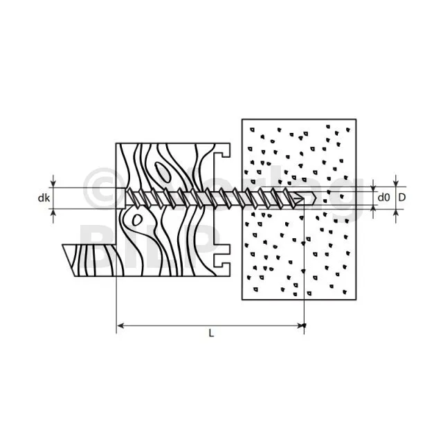 Einbaumontage in Holzprofilen. Für die Montage von Aluminium- oder Kunststoffprofilen ist die Flachkopf-Rahmenschraube („mit Kopf“) besser geeignet. - Montage ohne Dübel.