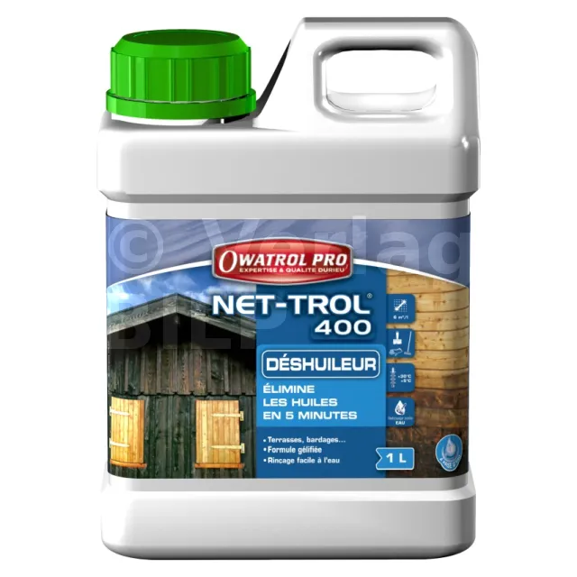 Beseitigen Sie in 5 Minuten die Öle, die Ihr Holz (Terrassen, Verkleidungen,...) schwärzen, mit dem professionellen Entöler NET TROL 400. Dank der Tiefenreinigung wird das Holz seinen natürlichen Aspekt wiederfinden.