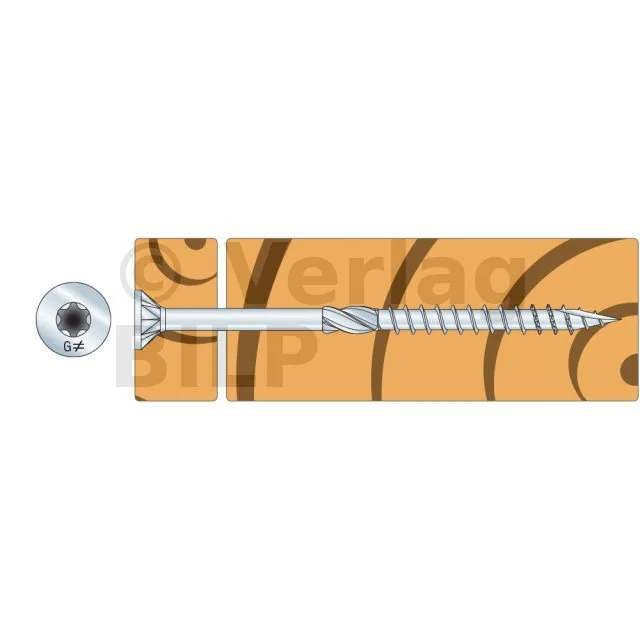 - Eine Schraube, deren Achse bei ESCR(XXX) 45 bis 90° von der Holzmaserung und bei den anderen Schrauben 90° von der Holzmaserung entfernt ist.