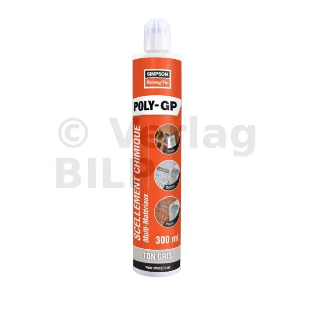 POLY-GP Multimaterialverbundmörtel ist ein chemischer Dübel zur Befestigung von Gewindestangen in Beton C20/C25 bis C50/60 und allen Hohl- und Vollmauerwerken.