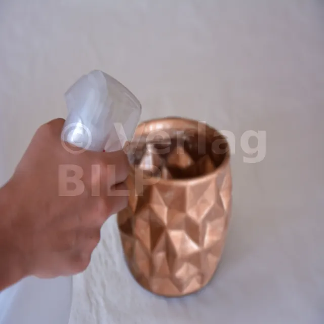 1- COPPER SPIRIT auf tragfähige, trockene und saubere Oberfläche auftragen. Diese Anwendung kann mit dem Sprühgerät oder mit einem Werkzeug (Tuch, Pinsel, Schwamm,...) erfolgen, wodurch zusätzliche dekorative Effekte erzielt werden können.