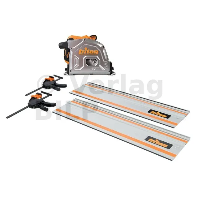Der Bausatz enthält die Tauchkreissäge TTS1400, einen Satz Schienen und Verbinder, einen Transportkoffer und Schraubzwingen.