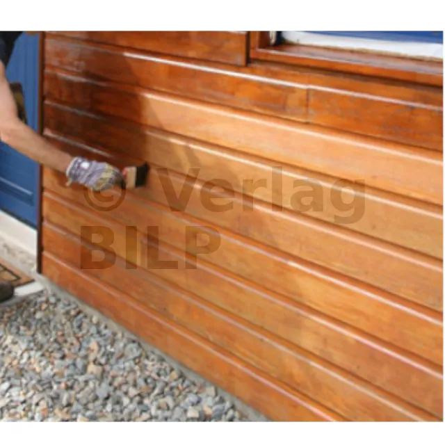 - Schützt und dekoriert Türen, Rahmen, Fenster, Balken, Verkleidungen usw. aus Holz mit Ausnahme von Rotzeder und Arten, die ein Antioxidans enthalten (z. B. Iroko). Vermeiden Sie harzreiche Hölzer.