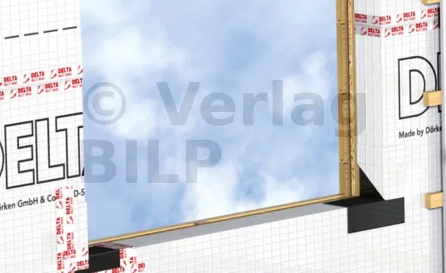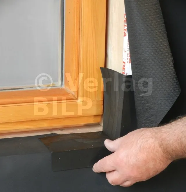 Flexible Ecke zur Abdichtung der Öffnungsrahmen von Holzrahmenkonstruktionen. Mit gerillter Oberfläche für leichtes Schneiden. UV-beständiges Material.