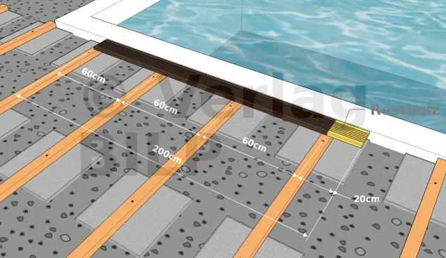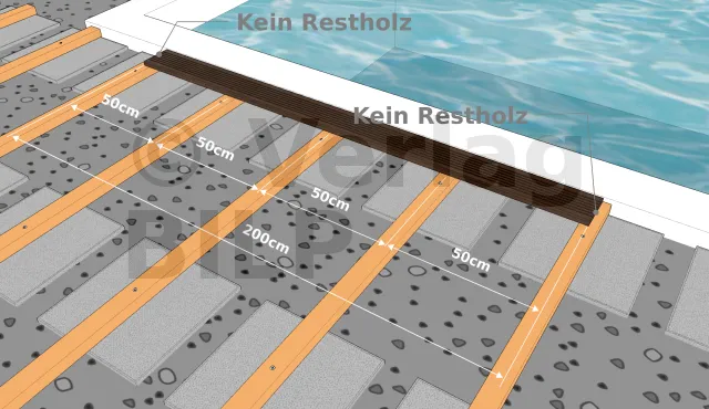 Die Achsabstandberechnung gibt uns nur ein Maximum, das nicht überschritten werden darf. In der Praxis muss auch die Länge der Dielen berücksichtigt werden. Tatsächlich ist es wichtig, die Schnitte zu optimieren, um die Dielenverluste zu begrenzen. Zu diesem Zweck wird einen definitiven Achsabstand a gewählt, der einem Vielfachen der Länge der Dielen entspricht. Zwar führt dies zu einer Verringerung des Achsabstands a und damit zu einer Erhöhung der Anzahl des Lagerholzes. Aber die Mehrkosten für die Lagerhölzer sind jedoch viel geringer als die, die durch einen Überverbrauch der Terrassendielen verursacht werden.