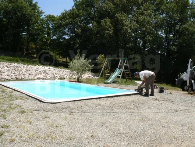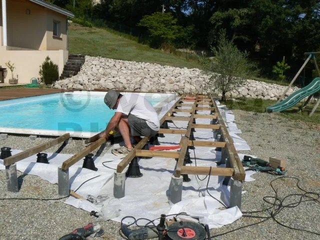 Regis hat ein Polyesterschwimmbecken bauen lassen und will jetzt rund herum eine Holzterrasse anlegen. Bei diesem Plan haben wir es mit mehreren technischen Problemen zu tun :