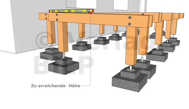 Die folgenden Abbildungen zeigen den Vorteil der Verwendung von verstellbaren PPRC-Stützenfüßen für den Einbau einer Holzterrasse :