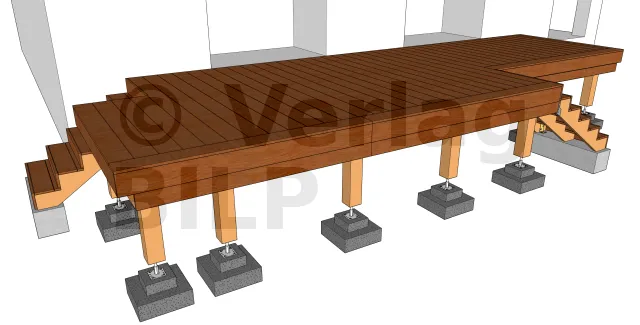 Die Umsetzung von dieser Holzterrasse auf Ständerwerk, die von zwei Treppenhäusern bedient werden, wurde durch die Verwendung der PPRC-Stützenfüße erheblich erleichtert.