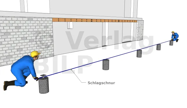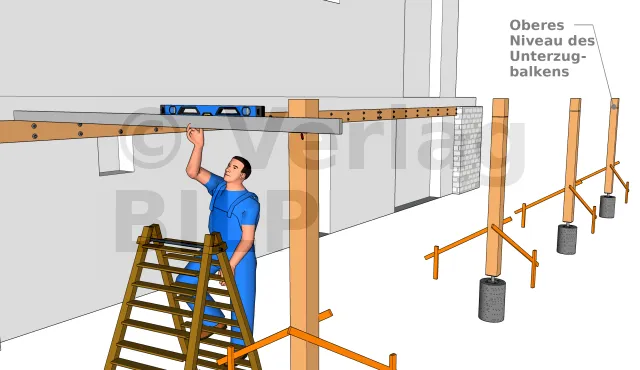 Um die genaue Höhe des Unterzugbalkens zu erhalten, muss ein Maurerlineal aufgestellt werden, auf dem eine Wasserwaage auf dem Mauerbalken platziert ist. Dann wird die untere Ebene des Lineals aufgetragen und diese Ebene entspricht der oberen Ebene des Unterzugbalkens. Auf diese Weise ist die Höhe des Mauerbalkens und des Unterzugbalkens gleich.