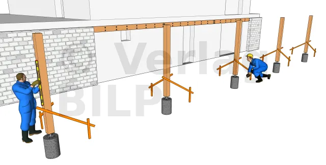 Die Befestigung der Ständer mit Leisten ist für die waagerechte Lage dieser Letzten vor der Montage der Unterzugbalken notwendig.