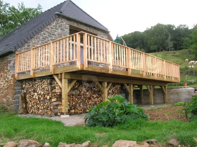 Dieser hübsche Hof im Zentralmassiv (Frankreich) wurde vor kurzem renoviert. Jacky, der Besitzer, möchte eine Hochterrasse, die an eine große verglaste Schiebetür angrenzt, hinzufügen. Holz ist das ideale Material für dieses Vorhaben.