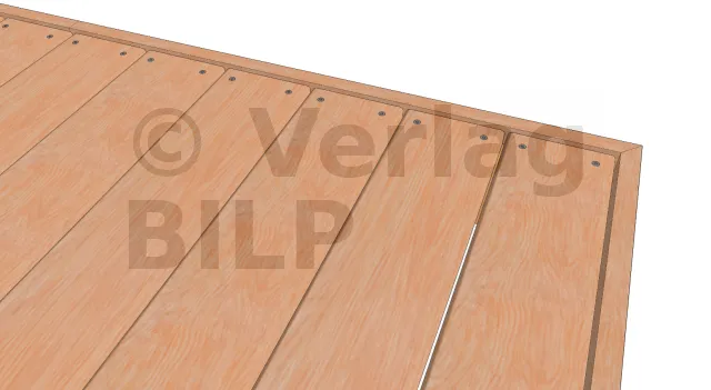 Die Abschlusskanten werden im Allgemeinen aus derselben Holzart hergestellt wie der Dielenbelag. Man kann Terrassendielen benutzen, aber besser ist es, wenn man etwas dickere Bretter zur Verfügung hat, die an den Kanten leicht angefast werden. Es gibt verschiedene Ausführungstechniken, die wir gleich vorstellen werden. Welchen man wählt, ist Geschmackssache. Die Kanten werden mit 6 mm dicken Edelstahlschrauben an der Unterkonstruktion befestigt. Die Länge der Schrauben wird nach den in Band 3 im Kapitel „Die Lagerhölzer“ erwähnten Regeln berechnet.
