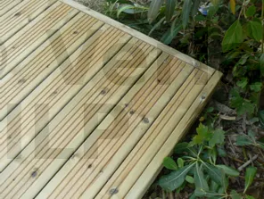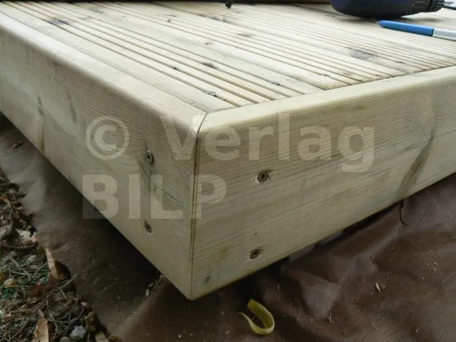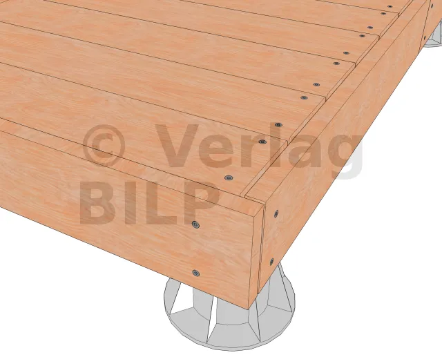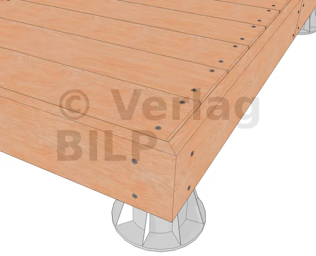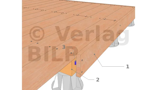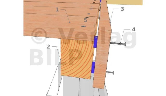 - 1 : Dielenbelag ; 2 : Balken ; 3 : Abschlusskante ; 4 : Edelstahlschraube 6 mm ; 5 : Kunststoffabstandshalter für mindestens 5 mm Hinterlüftung.