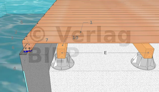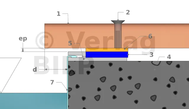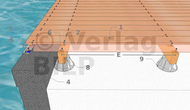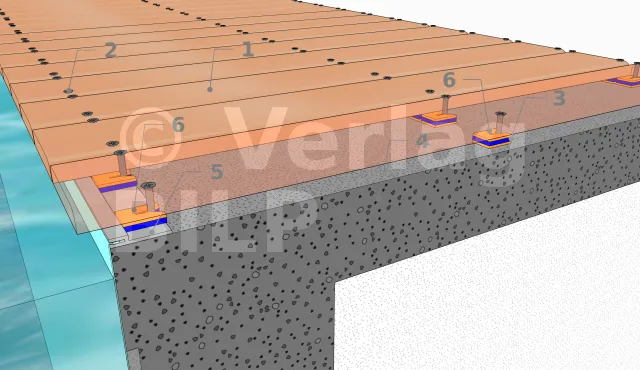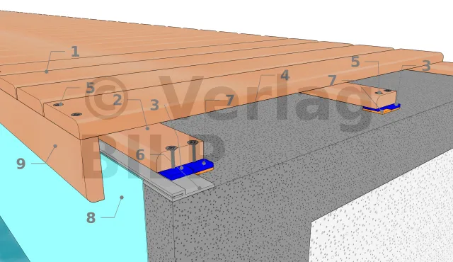 - 1 : Befestigung der Dielen, außer natürlich dort, wo man sie im Beton befestigen muss.