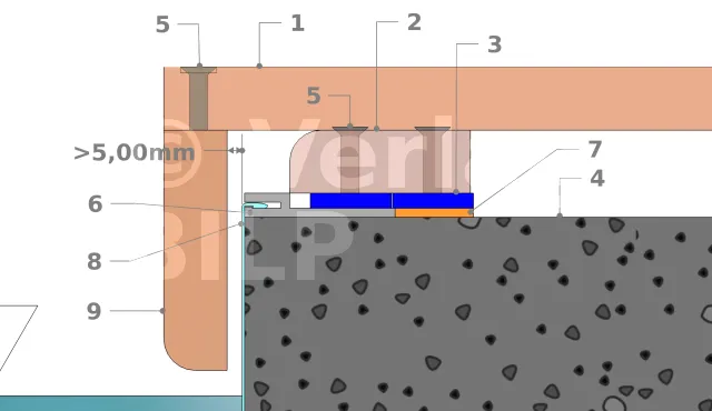 - 6 : Erhöhungskeil(e) mit einer Dicke, so dass die Unterseite der Diele das Profil nicht berühren darf 2
