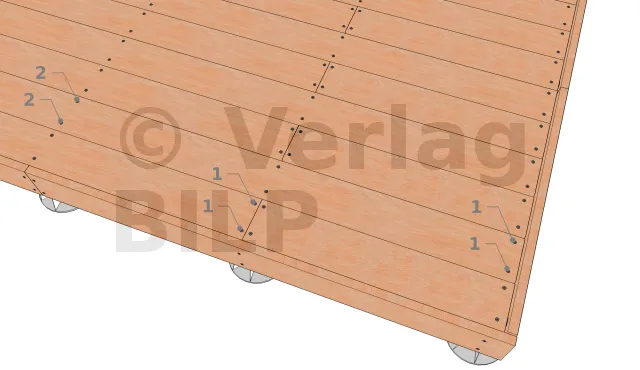 Grundsätzlich sollten zwei Schrauben an den Enden der Dielen sein. Die Dielen werden entlang der Lagerhölzer oder Balken befestigt. Bei der Standardlösung sollten zwei Schrauben auf der Dielenbreite verwendet werden. Diese Regel gilt für mittelfestes bis wenig festes Holz. Bei dauerhaften Hölzern kann bei den Zwischenbefestigungen jeweils eine Schraube eingespart werden. Nicht jedoch an den E[...]