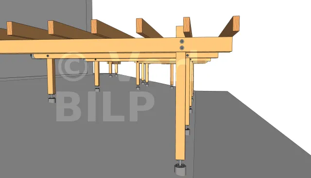 Bei einer Terrasse auf Ständerwerk sind die Stützen, die an den Betonsockeln befestigt sind und an denen die Unterzugbalken befestigt sind, um zwanzig oder mehr nach innen versetzt, um sie so weit wie möglich zu verdecken.