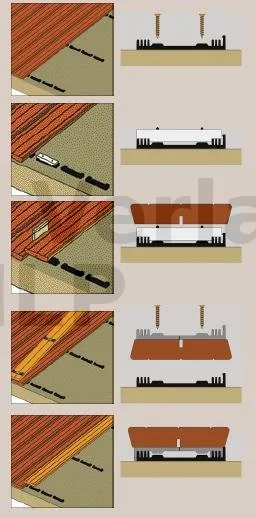 Das Befestigungssystem Jupit’Air verbindet das Prinzip des Klettverschlusses mit dem eines Clips. Dieses Positiv-Negativ-System bietet die Möglichkeit zum Ausbauen. Es ist bei allen Auflagen verwendbar, auch ohne vorhergehendes Verlegen von Lagerhölzern.