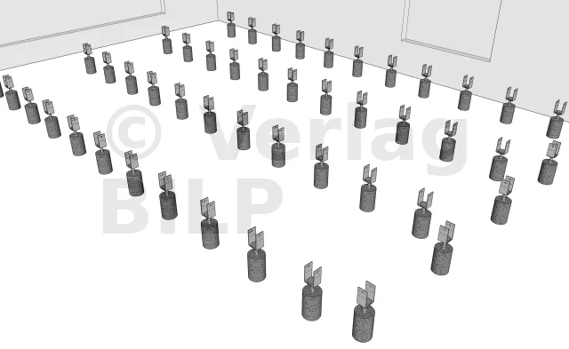 Der Einbau der Unterzugbalken beginnt mit der Abdichtung der verstellbaren Stützenfüsse vario in den noch frischen Beton.