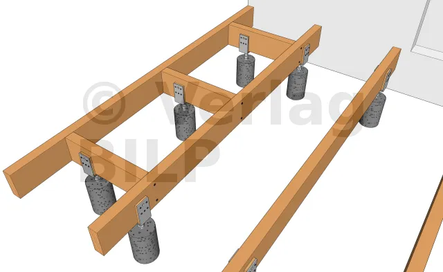 Zum Beispiel können Sie verstärkte Winkelverbinder verwenden, die mit Sechskant-Dübelschrauben an den Sockel und mit speziellen Verbindungsschrauben an den Lagerhölzer befestigt werden, oder eine Sechskant-Holzschrauben, Schlagdübel, indem Sie einige PVC-Keile unter den Unterzugbalken, Gewindestangen, die mit einer Mutter + Unterlegscheibe, Flachmetallverbinder oder MULTI-MONTI TimberConnect-Schrauben, die von oben befestigt werden, in den noch frischen Beton eingeschweißt werden.