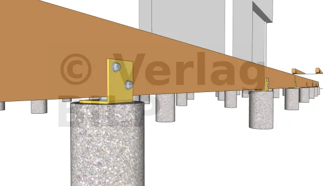 Es gibt auch mehrere Methoden zur Befestigung der Lagerhölzer an den Sockel . Sie können daher verstellbare Vario-Stützenfüße verwenden, die entweder mit Ankerbolzen, Betonankerschrauben oder durch chemische Dichtmasse der Gewindestangen und anschließendes Anziehen mit Muttern und Unterlegscheiben an den Sockel befestigt werden.