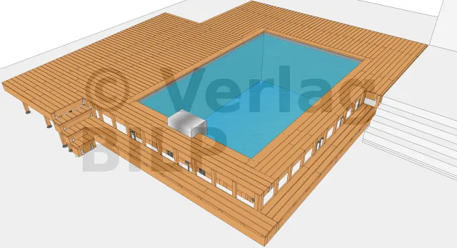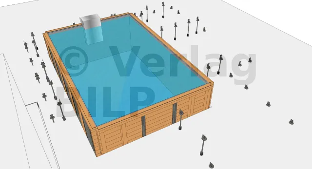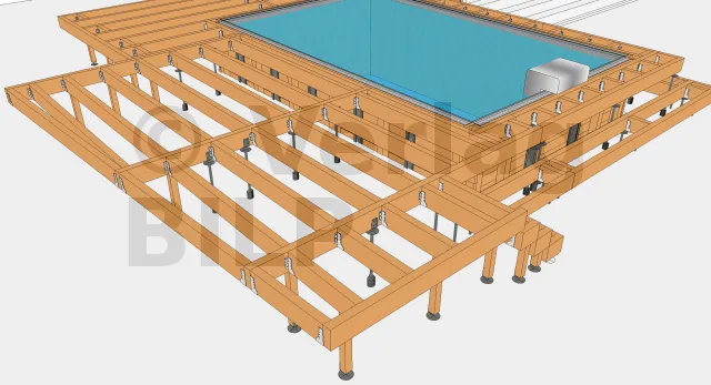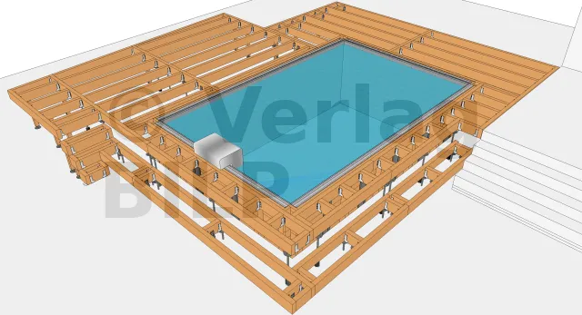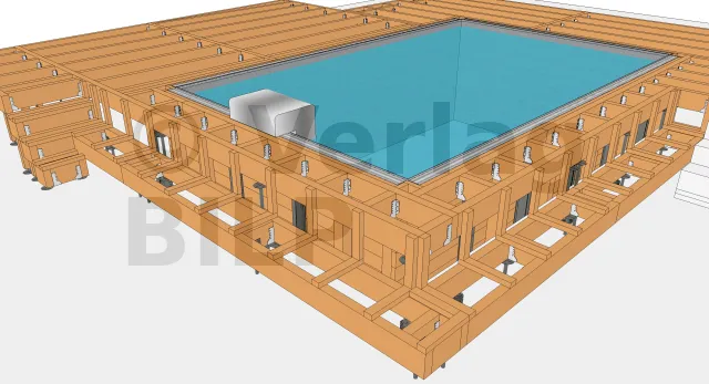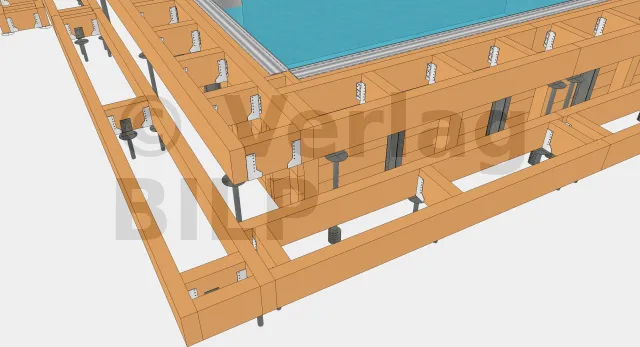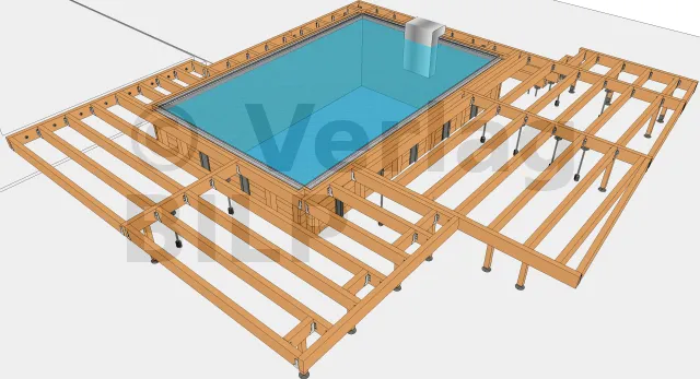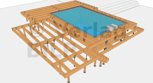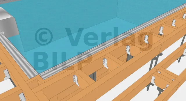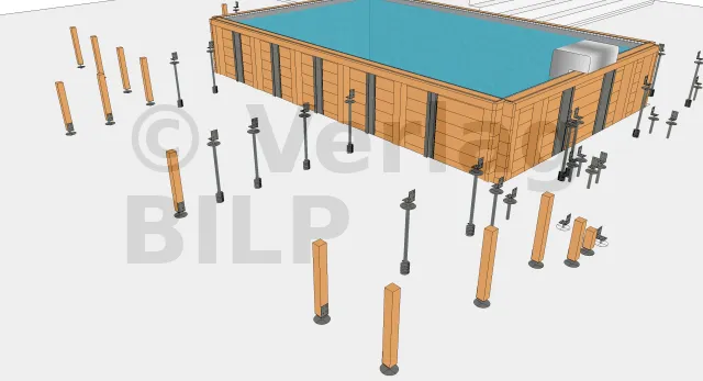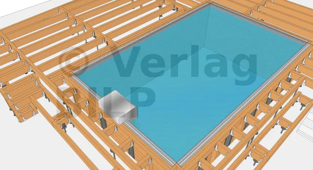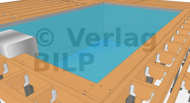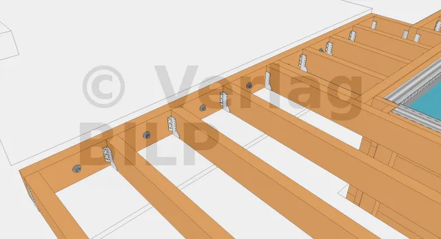 Dieser Tragbalken vereinfacht die Konstruktion, da er die Notwendigkeit vermeidet, Balkenschuhe direkt im Becken zu befestigen. Sie wird im Becken mit HECO-TOPIX große Rundkopfschrauben befestigt.