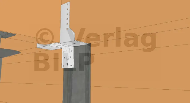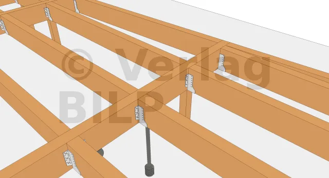 Um die Fundamentschrauben so weit wie möglich zu verbergen, wurden sie um etwa zehn Zentimeter nach innen versetzt. Anschliessend wurden Abstandhalter auf die Winkelverbinder der Fundamentschrauben gesetzt und mit Balkenschuhen mit galvanisch verzinkten Rillennägeln oder Schrauben für Torxkopfverbinder an den Balken befestigt.